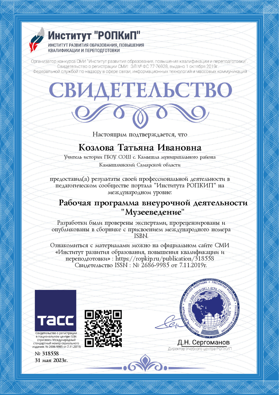 ПРОГРАММА ДЕЯТЕЛЬНОСТИ ШКОЛЬНОГО КРАЕВЕДЧЕСКОГО МУЗЕЯ ГБОУ СОШ с. Камышла